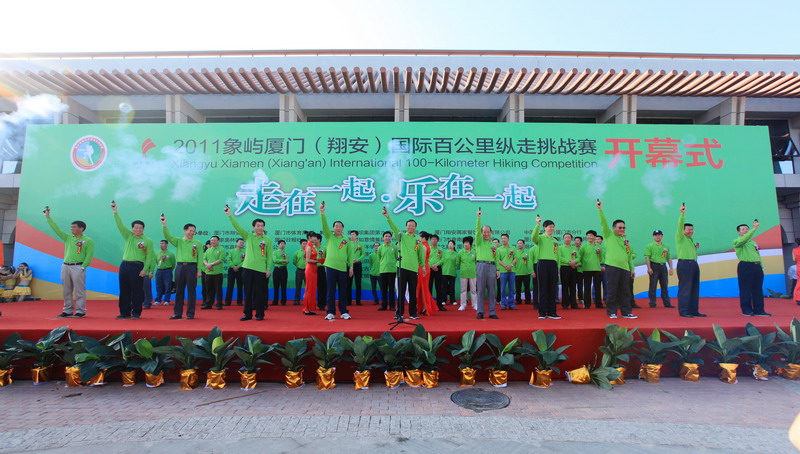 11月5日8時09分,明媚秋光里,廈門市委常委、副市長臧杰斌宣布2011象嶼廈門(翔安)國際百公里縱走挑戰(zhàn)賽開始,廈門市人大常委會副主任黃杰成、廈門市政協(xié)副主席陳昌生、國家奧林匹克體育中心副主任彭維勇、象嶼集團總裁張水利等一起為比賽鳴槍。來自28個國家和地區(qū)的近萬名運動愛好者,從大嶝小鎮(zhèn)·臺灣免稅公園廣場出發(fā),穿越田野、海濱、山巒、閩南古厝,開始了一段挑戰(zhàn)自我的征途。這其中,由象嶼集團員工及家屬、合作伙伴、共建單位等組成的千人象嶼團隊分外引人注目,浩浩蕩蕩的象嶼人走在一起、樂在一起,在欣賞沿途自然、人文風光的同時,也享受著挑戰(zhàn)自我、永不止步的健康向上,享受著與同事、親朋共度美好秋假的怡然歡樂。