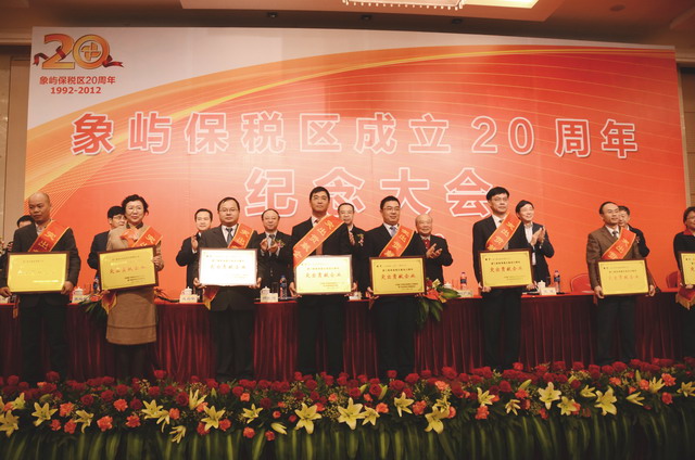 11月28日上午,在慶祝廈門象嶼保稅區(qū)成立20周年的喜慶日子里,廈門市委、市政府隆重舉行慶祝大會(huì),回顧保稅區(qū)20年的奮斗歷程,總結(jié)保稅區(qū)20年的發(fā)展經(jīng)驗(yàn),展望保稅區(qū)更加美好的發(fā)展未來(lái)。為保稅區(qū)建設(shè)立下汗馬功勞的10家突出貢獻(xiàn)企業(yè)和10位突出貢獻(xiàn)個(gè)人受到了隆重表彰。其中,廈門象嶼集團(tuán)有限公司、廈門象嶼股份有限公司榮獲突出貢獻(xiàn)企業(yè),象嶼集團(tuán)黨委書記、董事長(zhǎng)王龍雛,象嶼建設(shè)集團(tuán)常務(wù)副總經(jīng)理王澍陶榮獲突出貢獻(xiàn)個(gè)人。